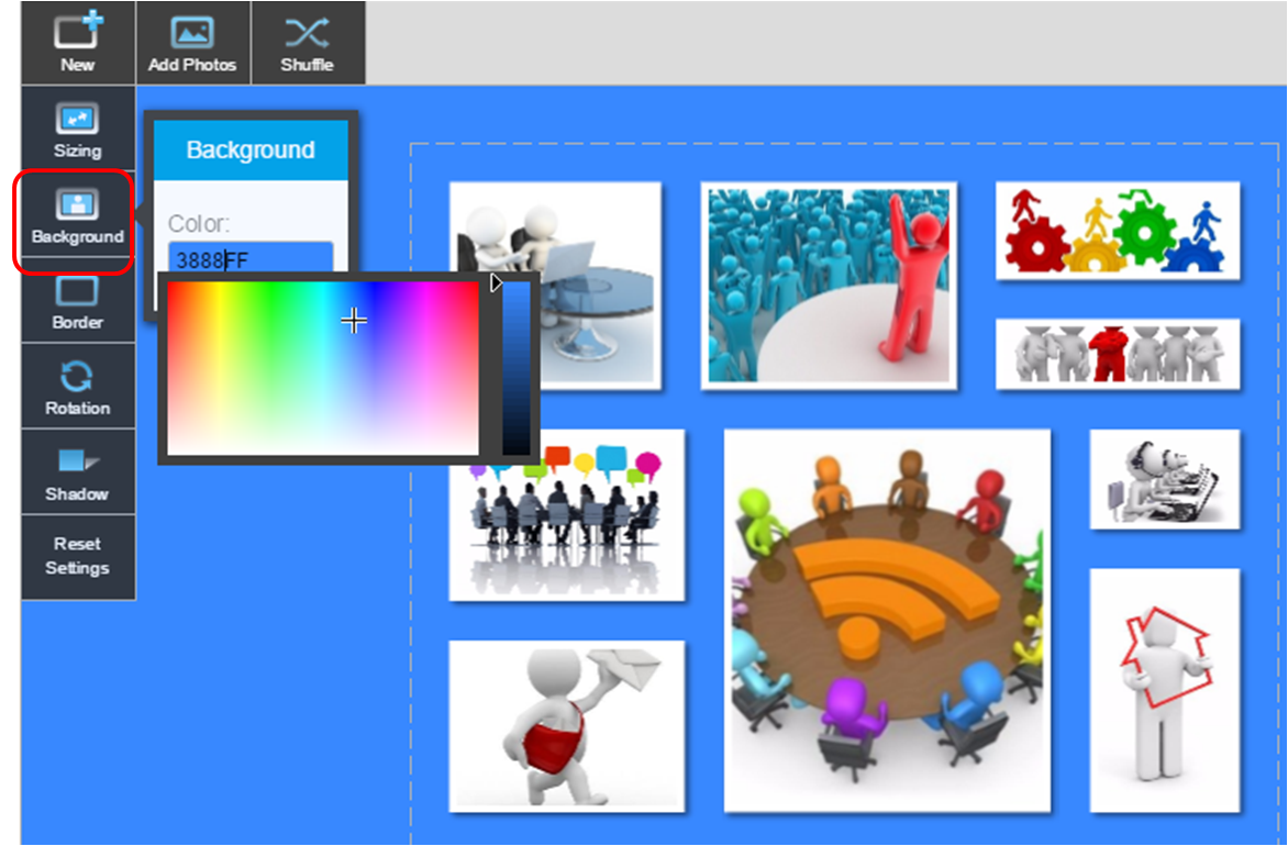 Зображення можна міняти місцями, зменшувати, збільшувати розмір, повертати, задавати фон, границю, тінь за допомогою набору інструментів, розташованих зліва від колажу.